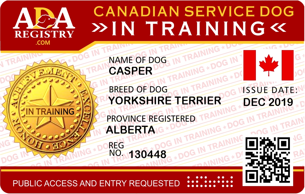 Member Since Nov 2019 Casper is my hearing service dog. He is a Yorkshire Terrier 3 years old, blue black tan colour. Casper lets me know when someone is at the door, a vehicle driving by, when the fire alarm goes off, and he tries to let people know I need help. Casper is also my husband and I family pet. Casper also is very protective. February 2023 Casper is doing well, but I need to continue his training for my Hearing Service Dog, Therapy Dog, and PTSD.