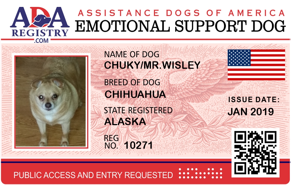 Emotional Support Dog Registration for CHUKY/MR.WISLEY