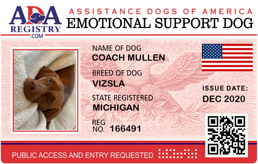 Emotional Support Dog Registration for Coach Mullen