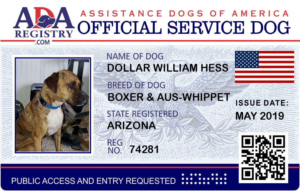 Service Dog In Training Registration for Dollar William Hess