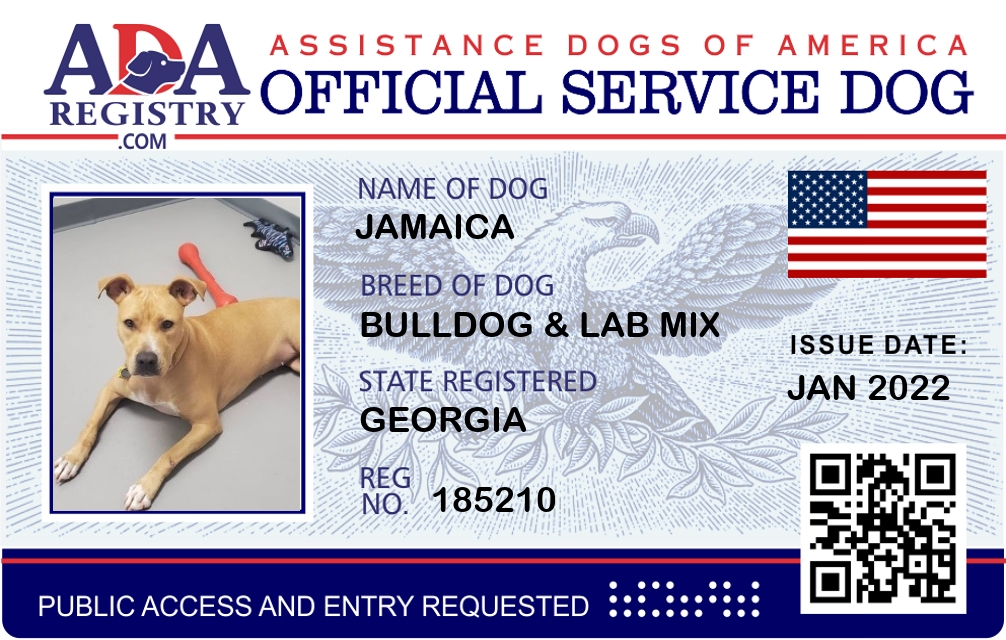 Jamaica is the kindest American Bulldog Lab mix service dog you will ever meet. If you see her traveling around the USA or Canada with her handler please stop us and say Hi. She loves humans of all ages and sizes. I must admit people who have a fear of large dogs judge her at first glance but if they humble themselves Jamaica would receive them with love and care for their mental disability. Jamaica has supported her handler spouse\’s anxiety, many kids in flight on airlines suffering from anxiety and fear of flying, relieves pretesting anxiety in kids at schools, and the elderly suffering from mobility issues during early signs of dementia from ages 62 to 110. Who knew she would become so adaptable to helping one to many during her service dog training? She is a loving soul sent from heaven to provide community support with the spirit of an angel trained to be gentle and approach with love and care.