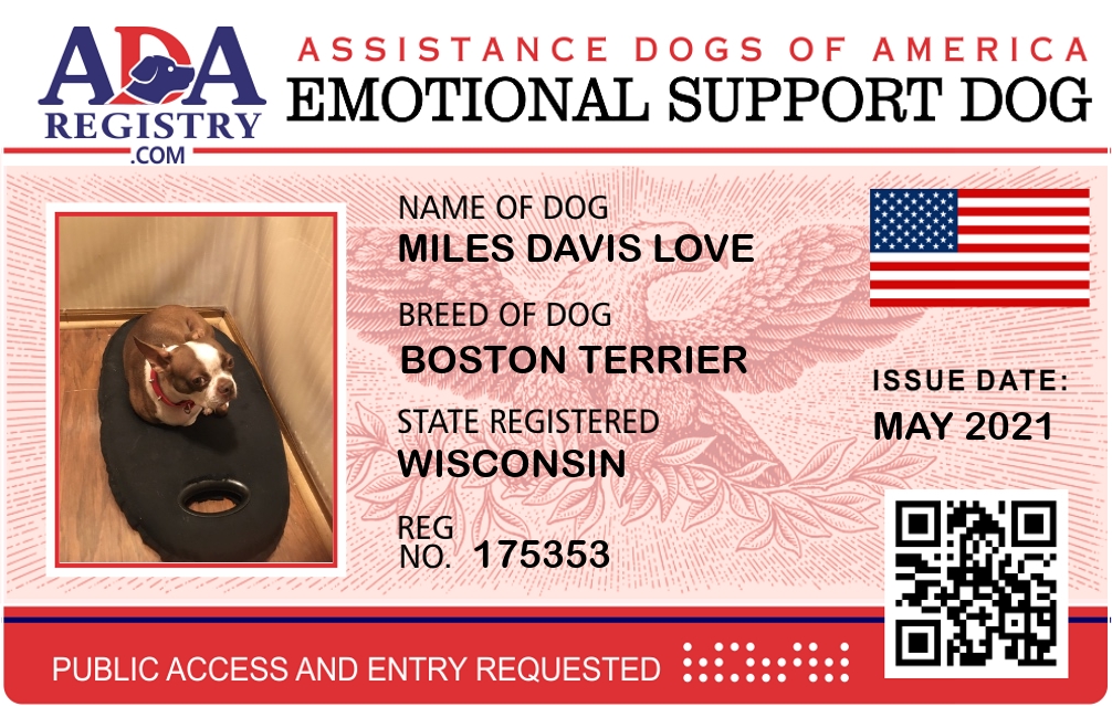 Emotional Support Dog Registration for Miles Davis Love