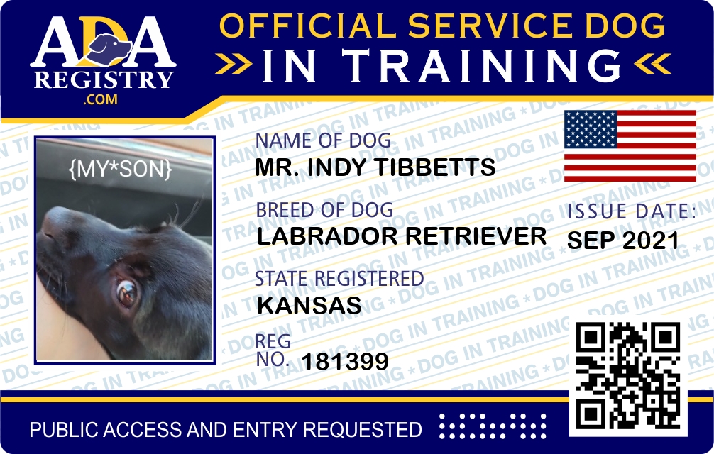 Service Dog In Training Registration for MR. INDY TIBBETTS