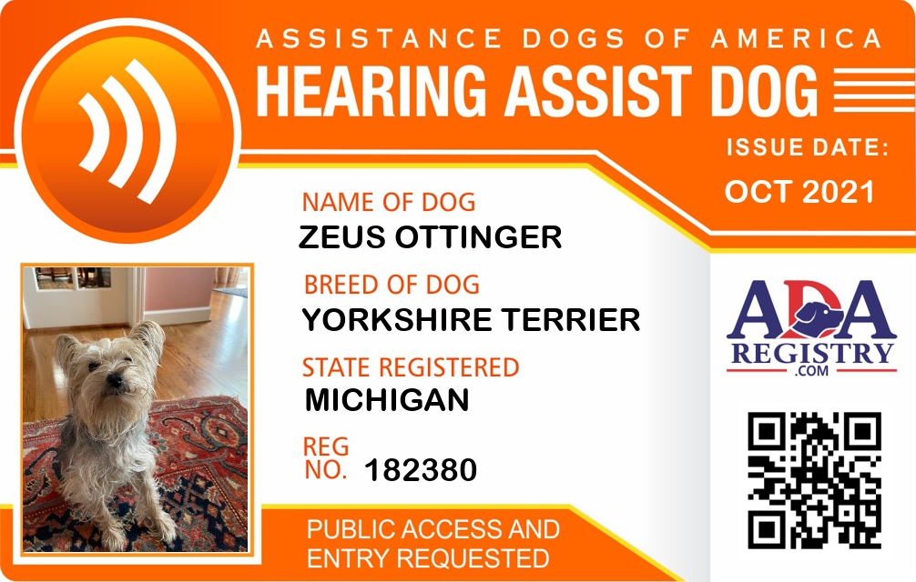 Hearing Assistance Dog Registration for Zeus Ottinger