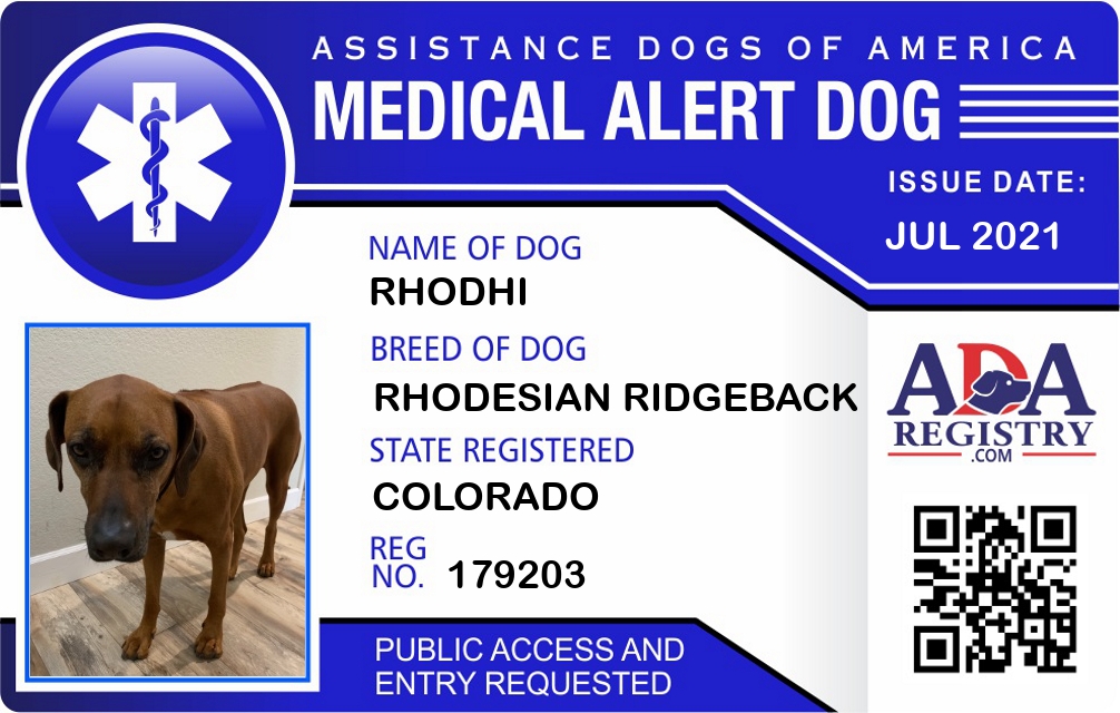 Rhodhi has been trained and certified as a Medical Alert Service Dog by Chris Winkler at Elite K-9 in Castle Rock Colorado. Please call Chris directly with any questions or concerns: Chris Winkler: (720)334-0233