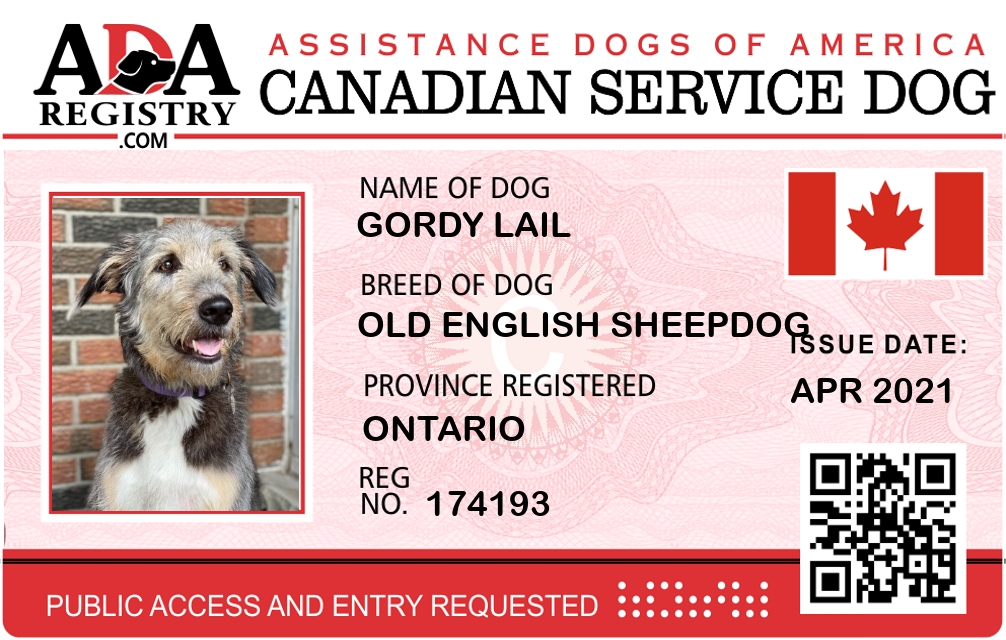 Service Dog Registration for Gordy Lail