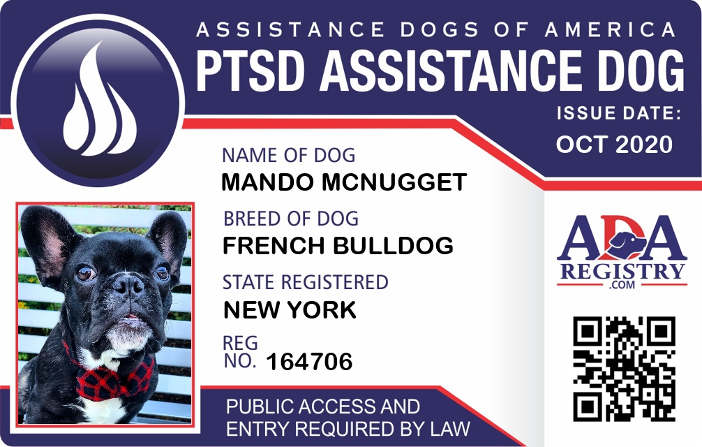 Mando McNugget is a French Bulldog who is trained to provide Deep Pressure Therapy for his handler. He enjoys playing fetch, eating snacks, and providing psychiatric relief for his handler.