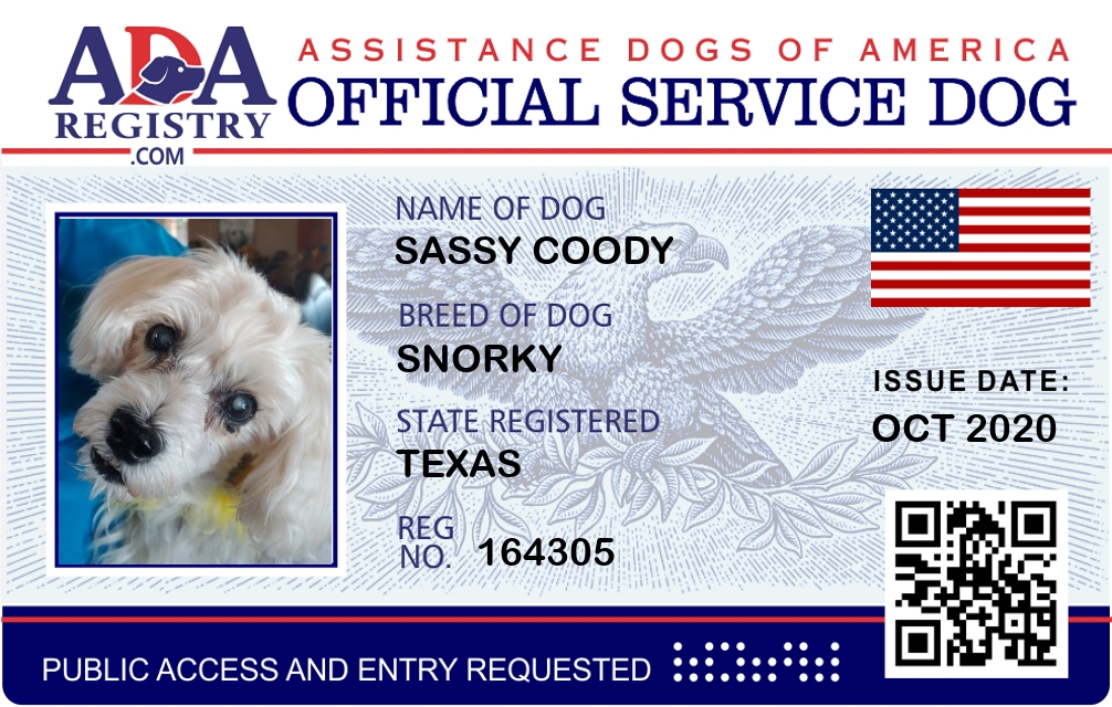 Service Dog Registration for Sassy Coody