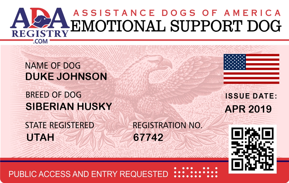 Emotional Support Dog Registration for Duke Johnson