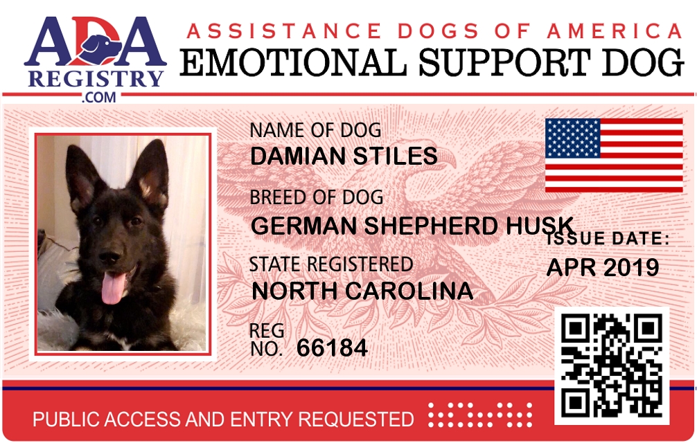 Emotional Support Dog Registration for Damian Stiles