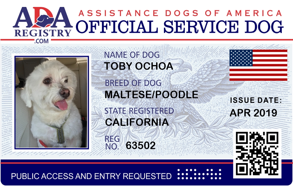 Emotional Support Dog Registration for Toby Ochoa