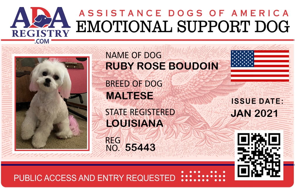 Emotional Support Dog Registration for Ruby Rose Boudoin