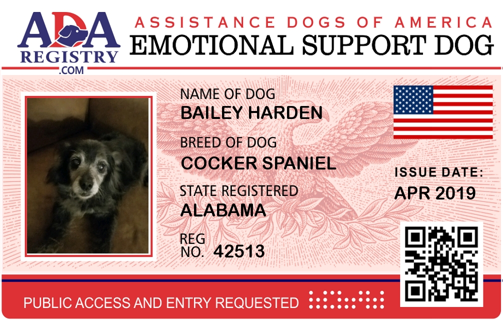 Emotional Support Dog Registration for Bailey Harden