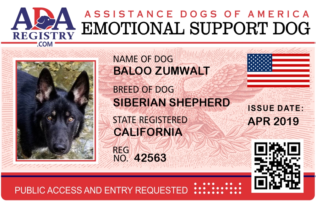 Emotional Support Dog Registration for Baloo Zumwalt