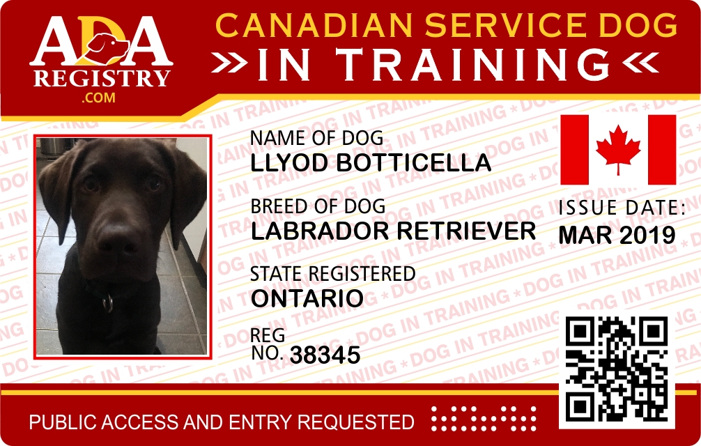Service Dog In Training Registration for Llyod Botticella