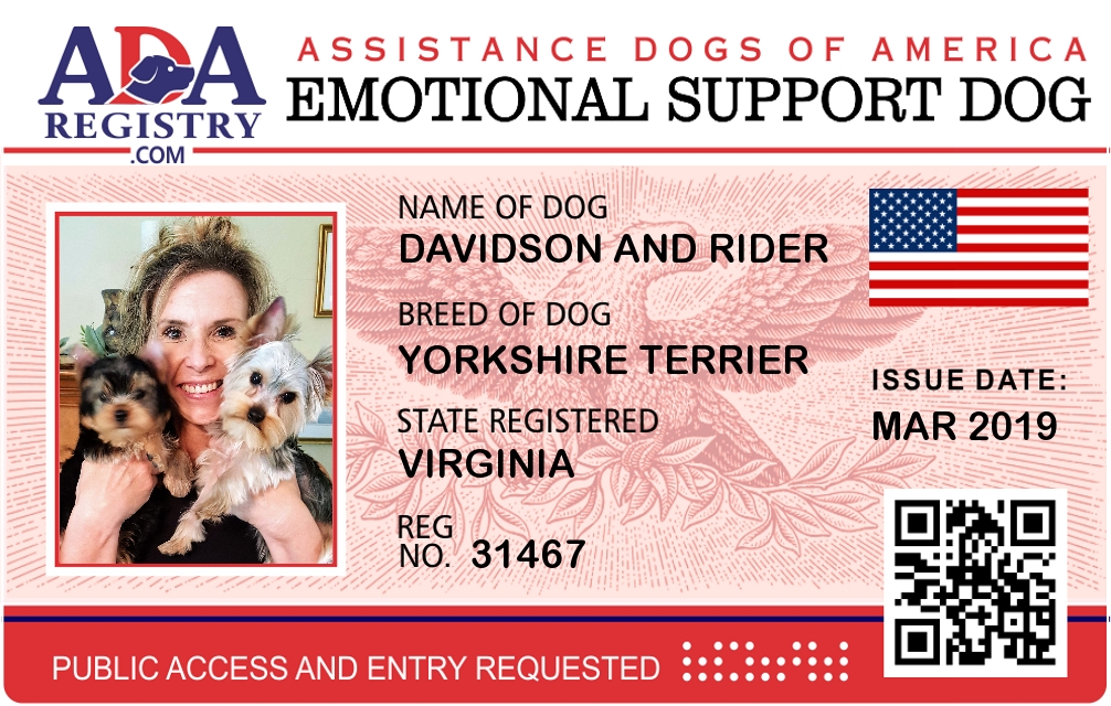 Emotional Support Dog Registration for DAVIDSON and RIDER