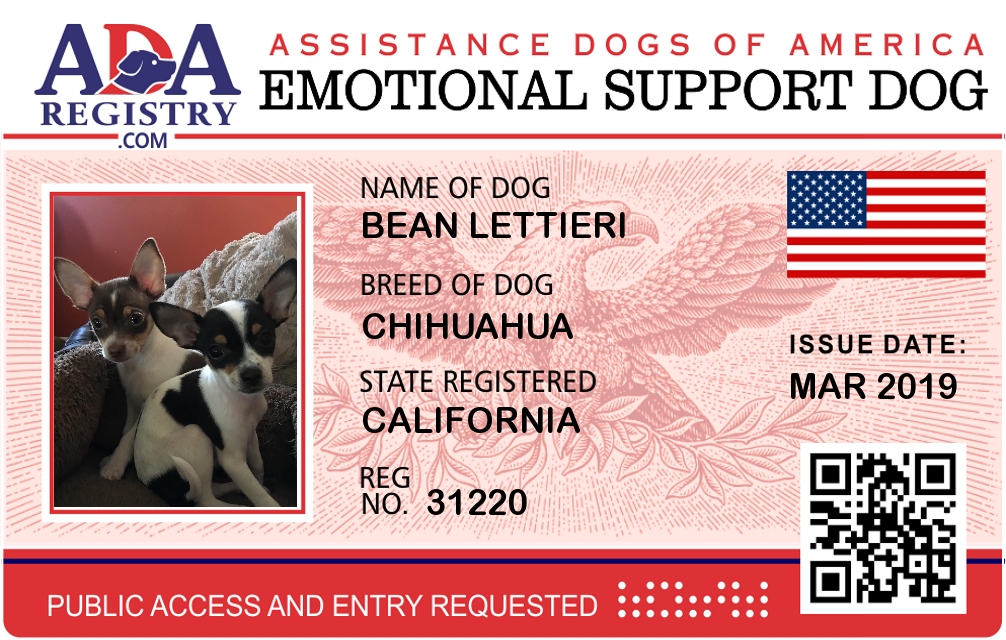 Emotional Support Dog Registration for Bean Lettieri
