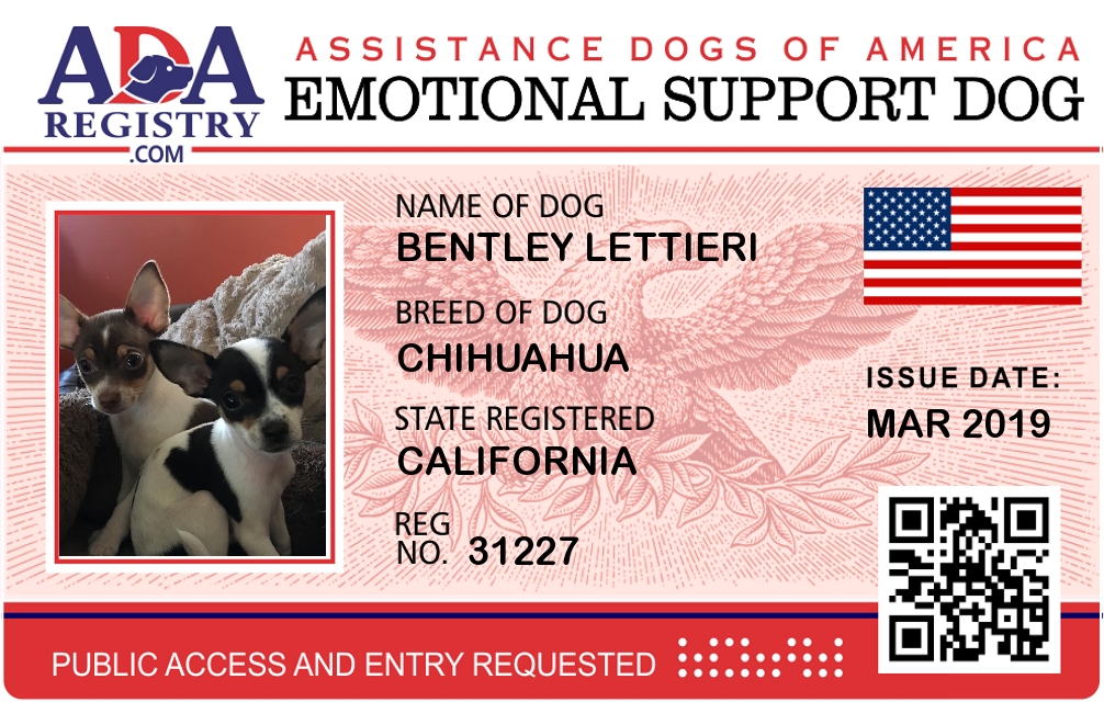 Emotional Support Dog Registration for Bentley Lettieri