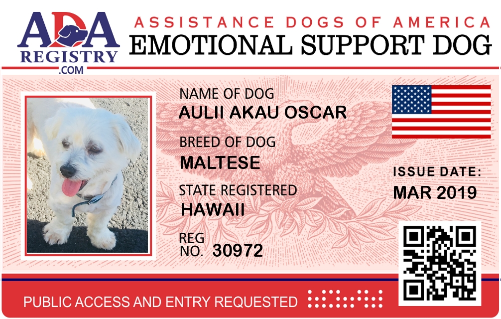 Emotional Support Dog Registration for Aulii Akau Oscar