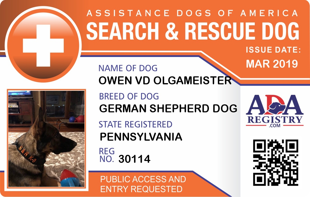 Search And Rescue Dog Registration for Owen VD Olgameister