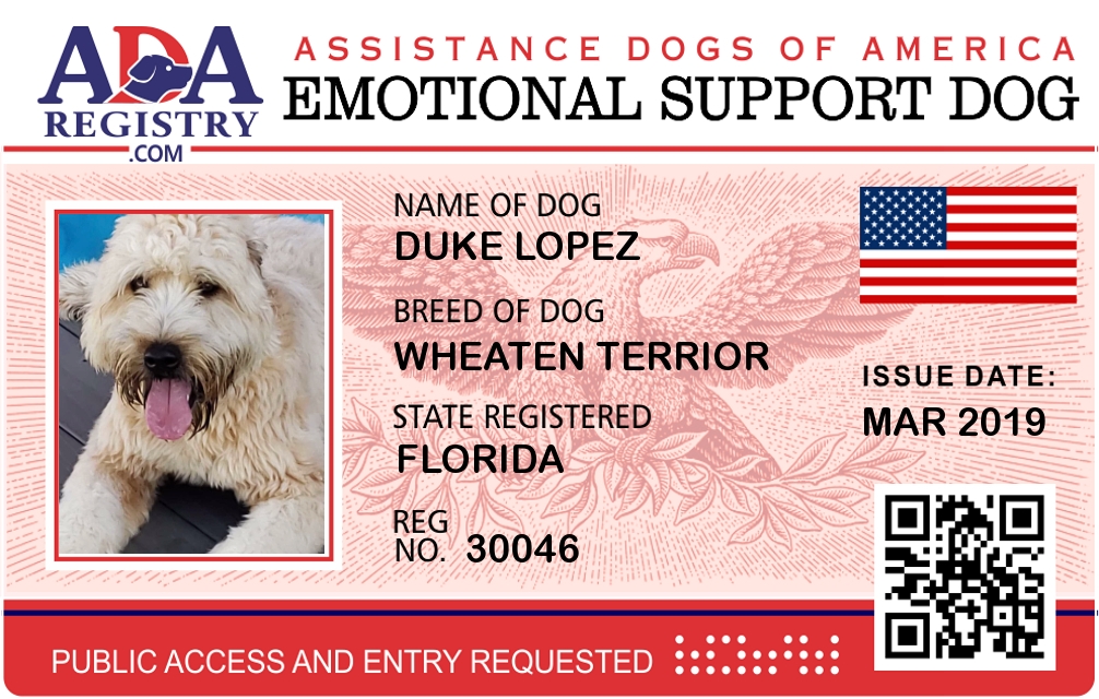 Emotional Support Dog Registration for Duke Lopez
