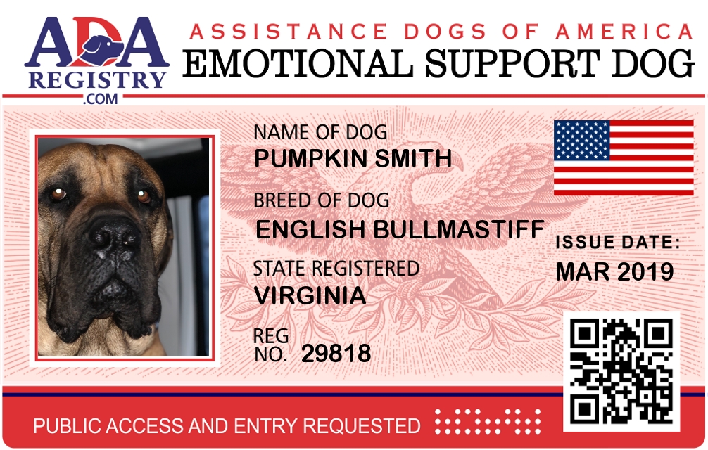 Emotional Support Dog Registration for Pumpkin Smith
