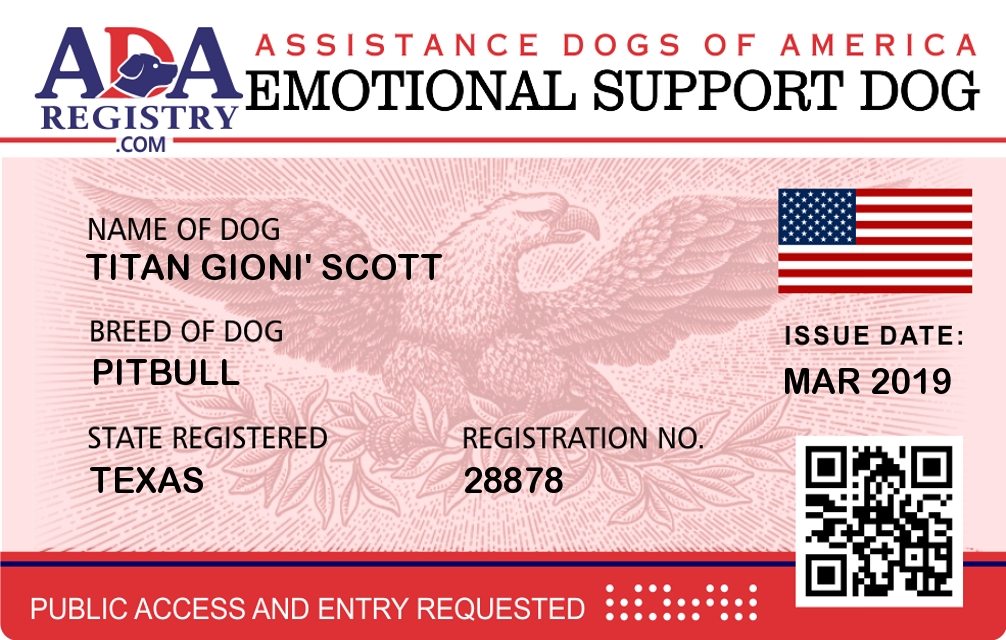 Emotional Support Dog Registration for Titan Gioni' Scott