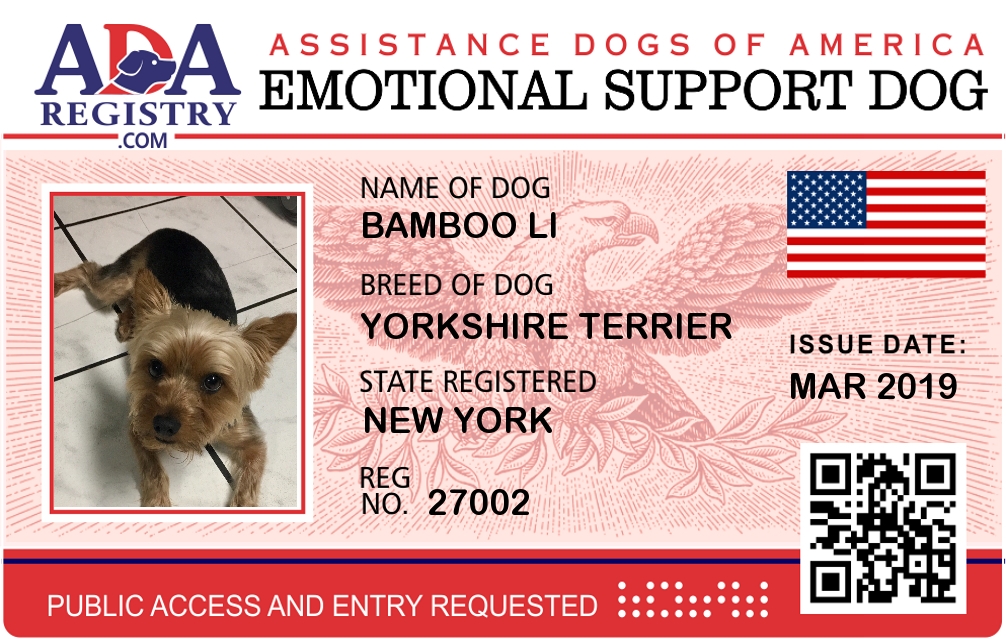 Emotional Support Dog Registration for Bamboo Li