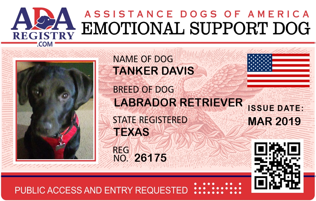 Emotional Support Dog Registration for Tanker Davis