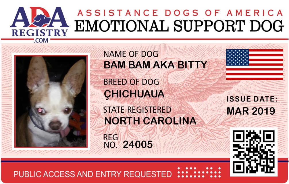 Emotional Support Dog Registration for Bam Bam AKA Bitty