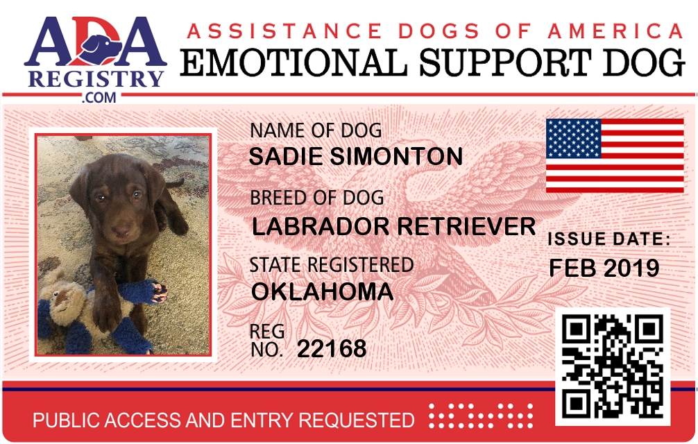 Emotional Support Dog Registration for Sadie Simonton