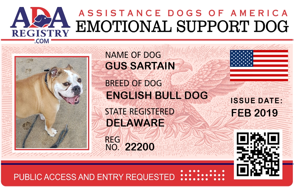 Emotional Support Dog Registration for Gus Sartain