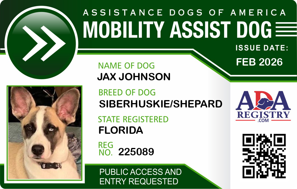 Brace / Mobility Assistance Dog Registration for Jax Johnson