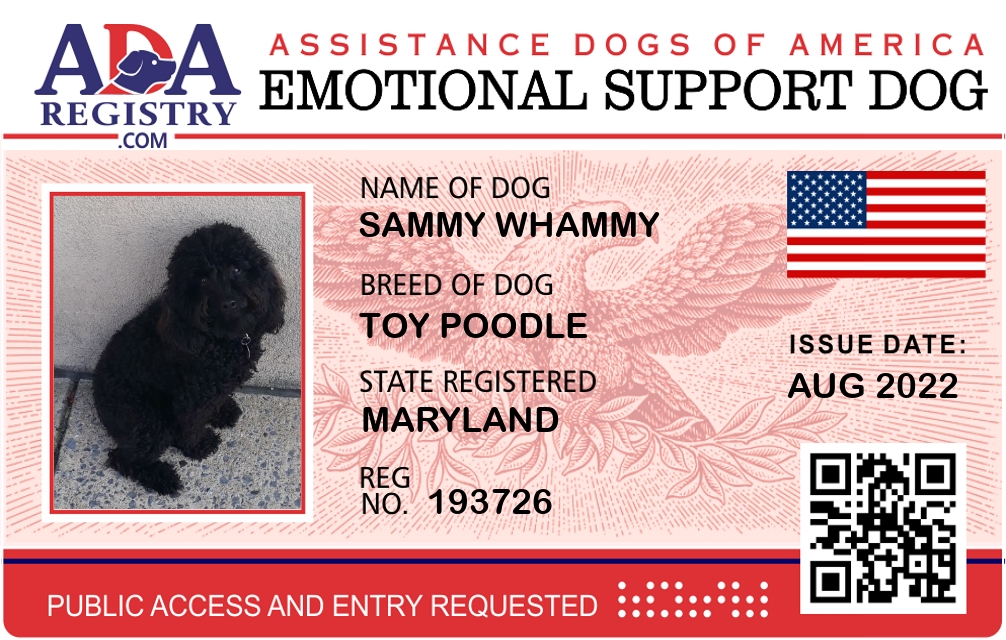 Emotional Support Dog Registration for Sammy Whammy