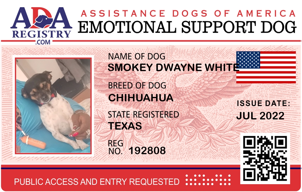Emotional Support Dog Registration for Smokey Dwayne White
