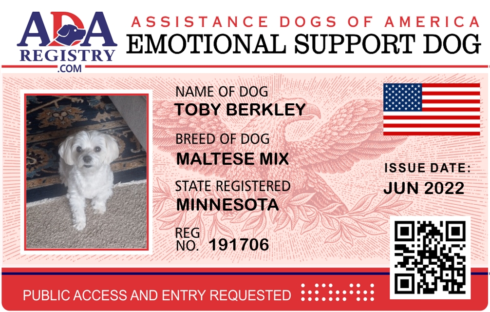 Emotional Support Dog Registration for Toby Berkley