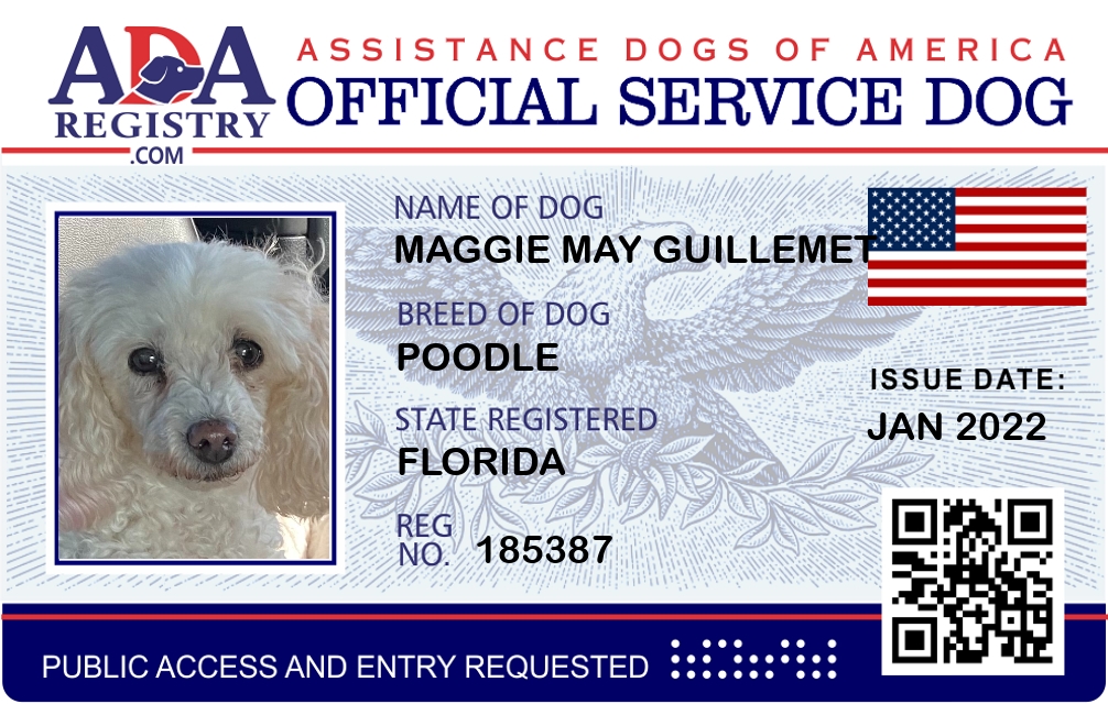 Maggie Guillemet—- is an amazingly smart Service dog, Having Maggie with me, lessens my anxiety–Fear, confusion, and more. I \’v experienced severe head injury in an automobile accident, and Maggie knows everything about me. Maggies knows how I am feeling, we have our commands, she is my 24-hour doctor.