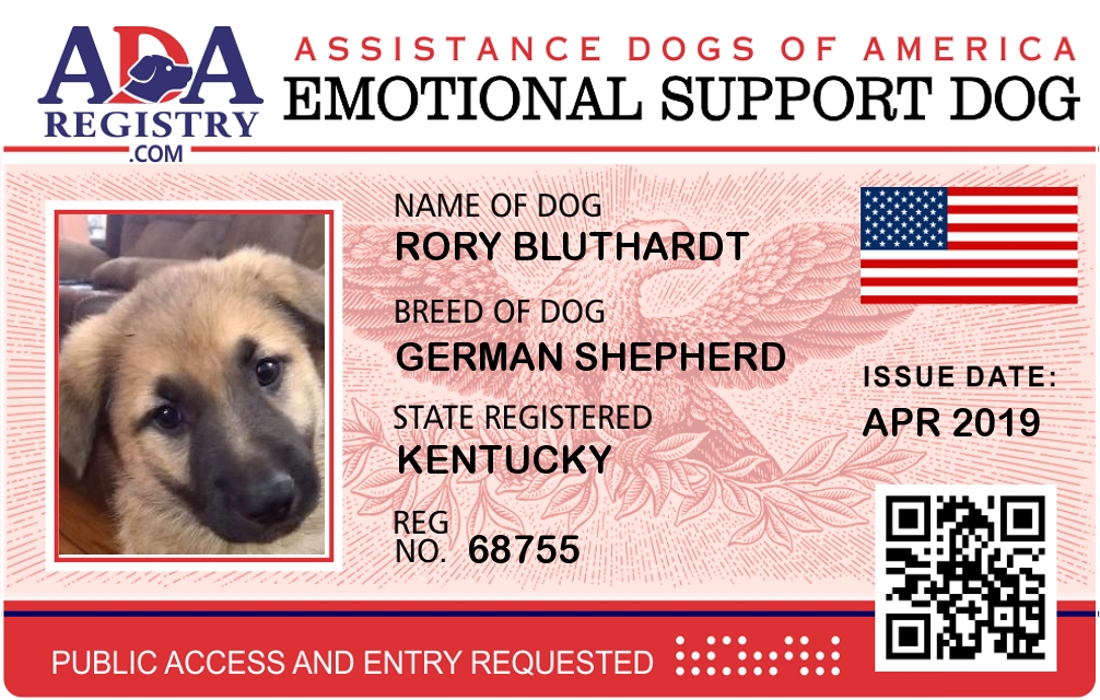 Emotional Support Dog Registration for Rory Bluthardt