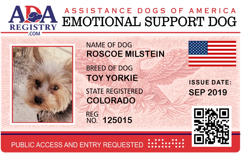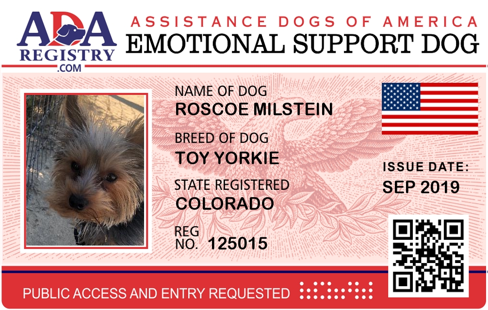 Emotional Support Dog Registration for Roscoe Milstein