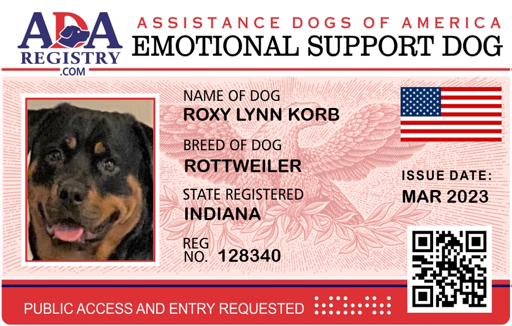 Emotional Support Dog Registration for Roxy Lynn Korb