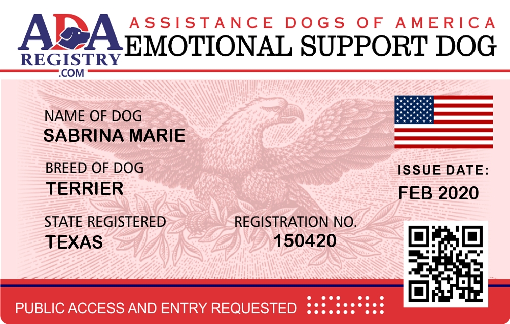 Emotional Support Dog Registration for Sabrina Marie