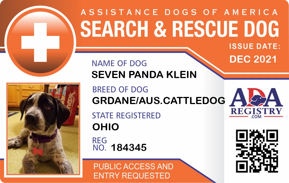 Search And Rescue Dog Registration for Seven Panda Klein