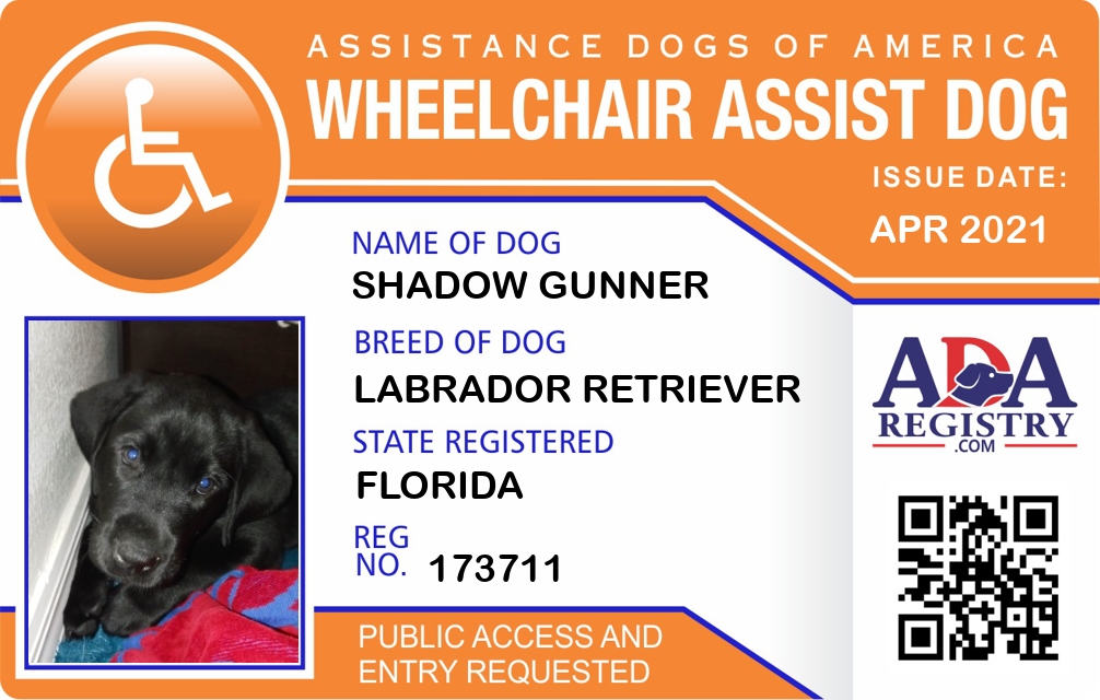 Wheel Chair Assistance Dog Registration for Shadow Gunner