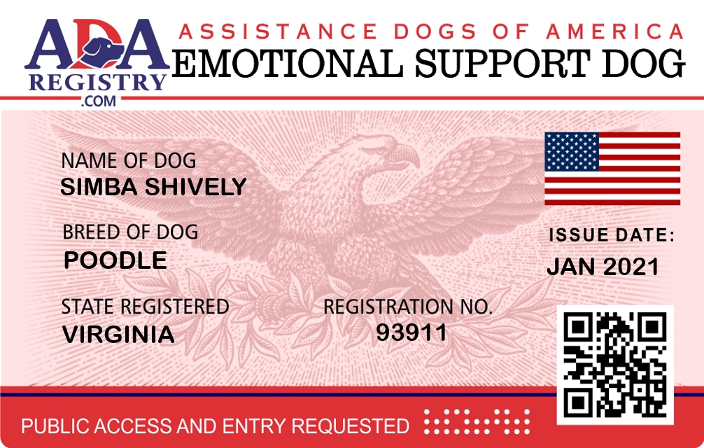 Simba Shively is an emotional support dog for me and my family. He helps with our moods, ptsd, anxiety, and helps my autistic grandson.