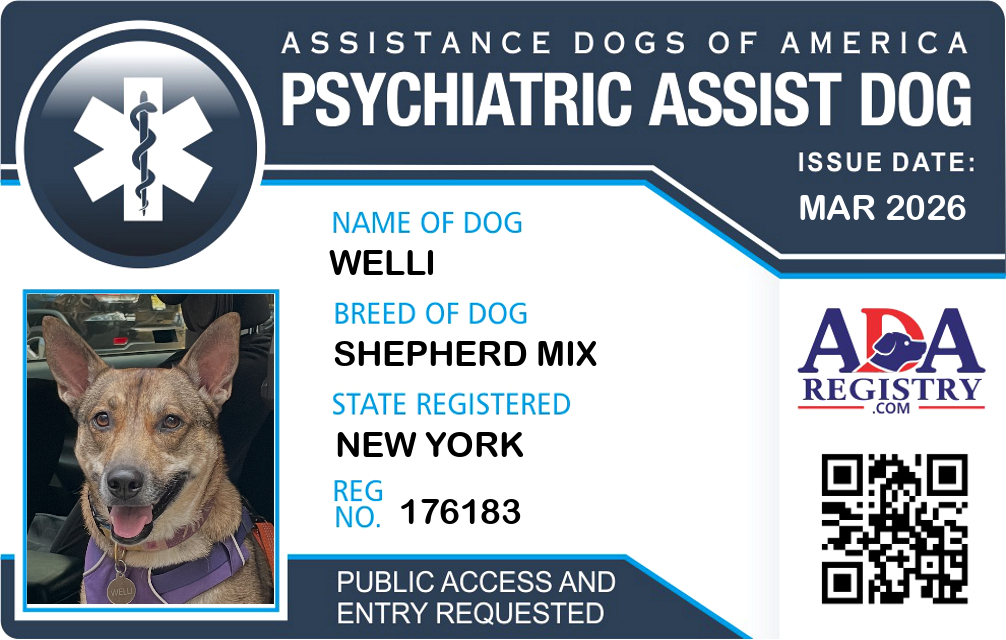 Member Since May 2021 Welli is a 27 pound Shepherd mix. While she was initially an ESA, I have trained her and certified her as a PSD. I suffer from PTSD and frequent panic attacks. She is trained to lie on top of me, act as a weighted blanket, and bring me out of dissociative episodes. Before Welli, my panic attacks would last for hours. She reminds me of what is in front of me, bringing me back to reality quickly. She is a saving grace in all ways.