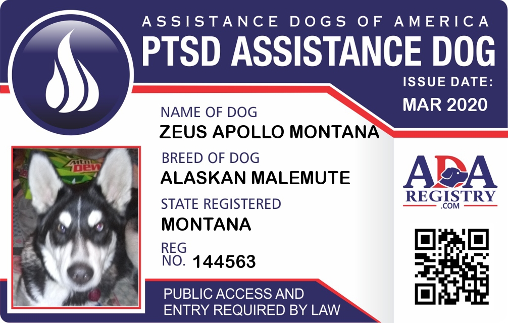 PTSD Assistance Dog Registration for Zeus Apollo Montana