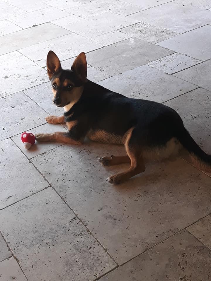 Dusty’s adoption day on February 14, 2022. Just lounging and relaxing in Brad and Kristi’s backyard in Allen, TX. He quickly destroyed that toy that is on the ground next to him.