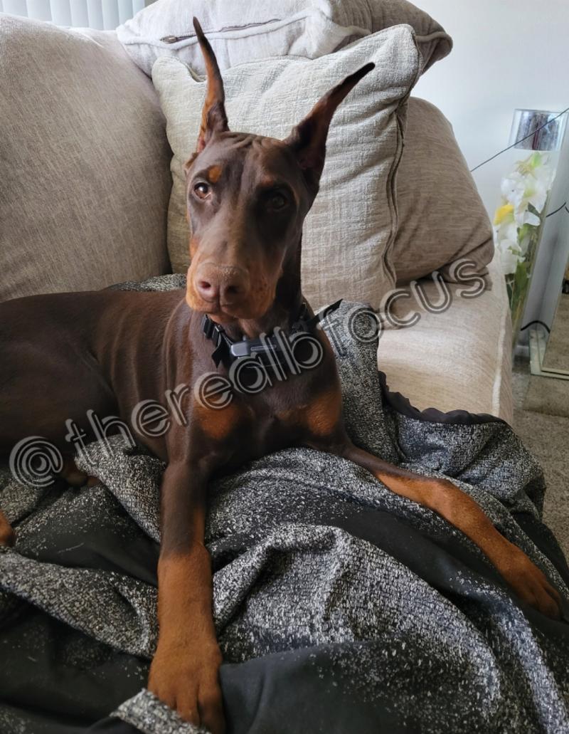 European Doberman female red and tan service dog in training. Very friendly energetic coachable loving beautiful dog.