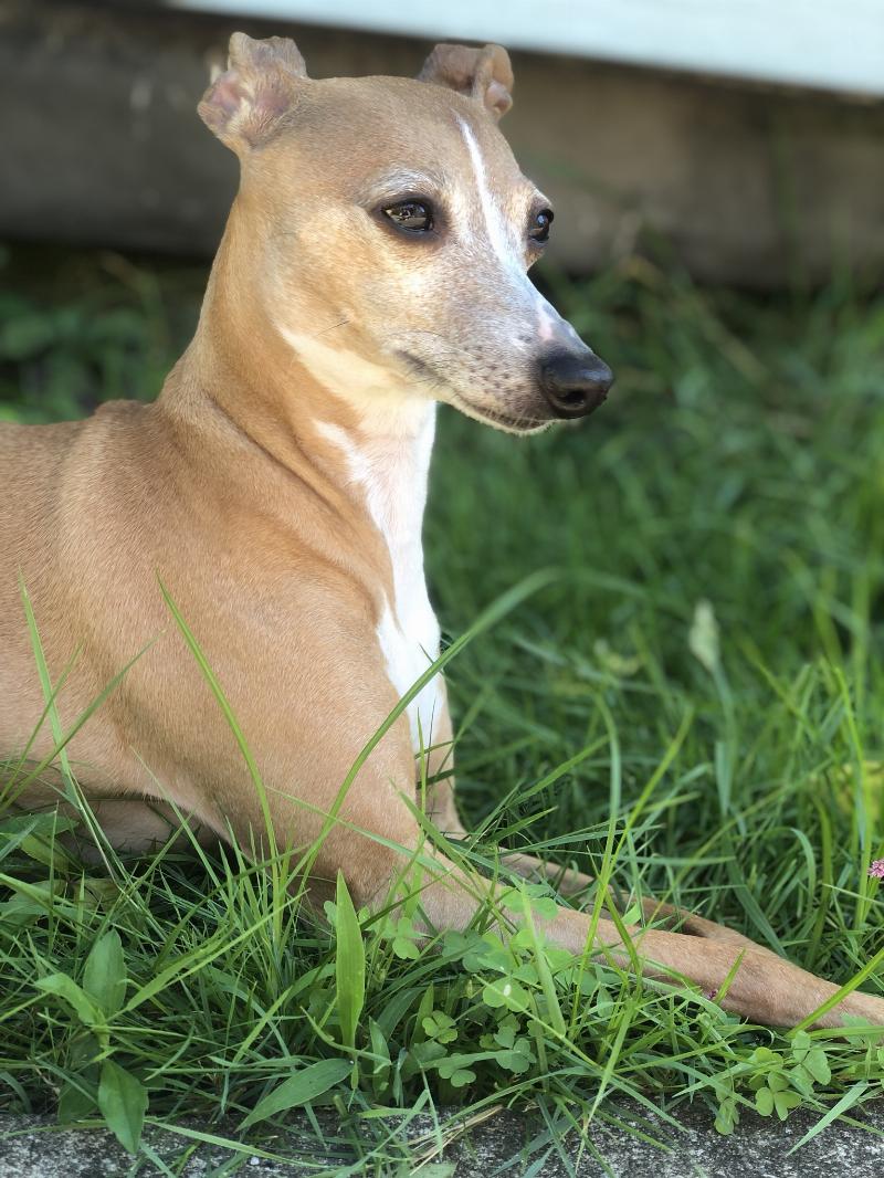 My Italian Greyhound, Fig, lounging in the sun. She loves summer weather and we take lots of walks around the neighborhood when it’s warm out. When it’s cold, you can find her snuggled in her blankets or with her sisters, Lilo and Elsa, who are Saint Bernards!