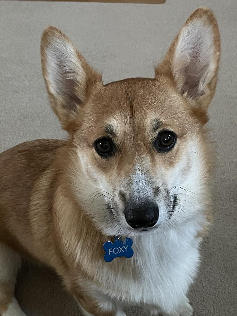 A photo of Foxy (a Pembroke Welsh Corgi who is red and white) at about 1 year old while relaxing at his home.